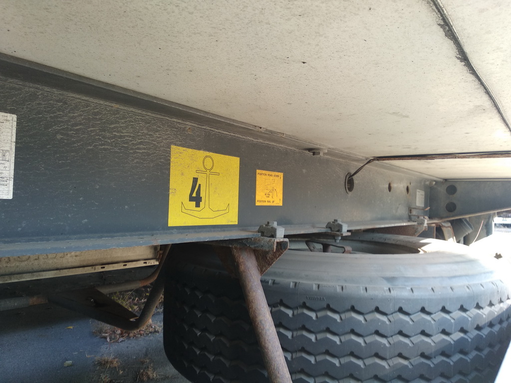 Air connection (Red/Yellow Button) / Power connection (1 x 15 + Two x 7 poles) / ABS / EBS / Refrigeration unit / Rail codification / Train loading device / Ferry Lashing / Side collision protection / Wheel chock ( 2 ) / Spare wheel holder ( 2 ) / Spare wheel ( 1 ) / Tool box ( 1 ) / Access ladder / Rear of trailer (Container doors) / Locking bars door (4) / Floor (Aluminium floor) |